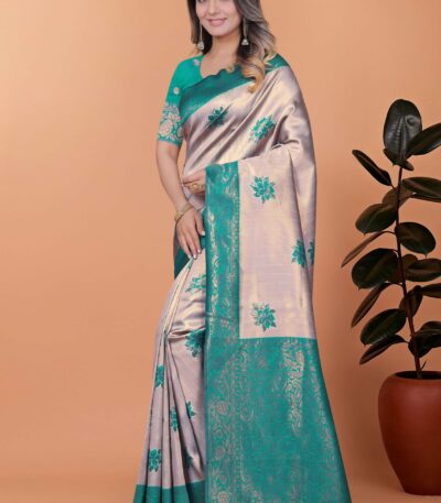 Ivory Glow Banarasi Silk Saree with Emerald Green Zari Work & Blouse | Wedding, Puja, Festive & Traditional Wear
