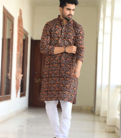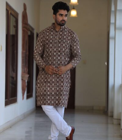 Mens Brown & Black Printed Cotton Kurta with White Pajama ? Traditional Ethnic Wear for Festive & Wedding