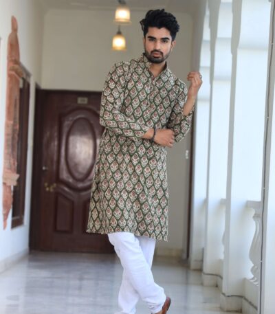 Mens Green Printed Cotton Kurta with White Pajama ? Traditional Festive & Casual Wear