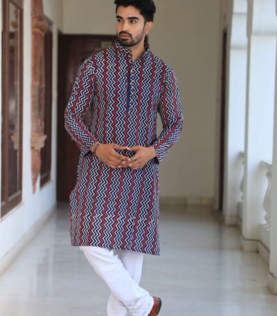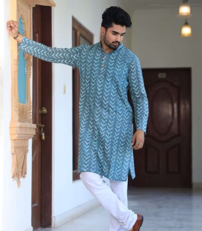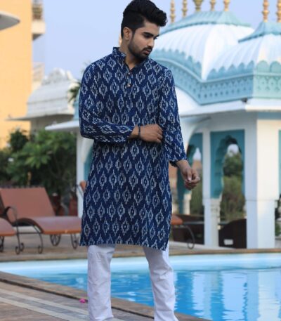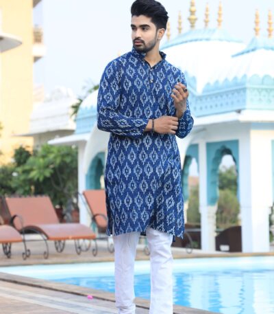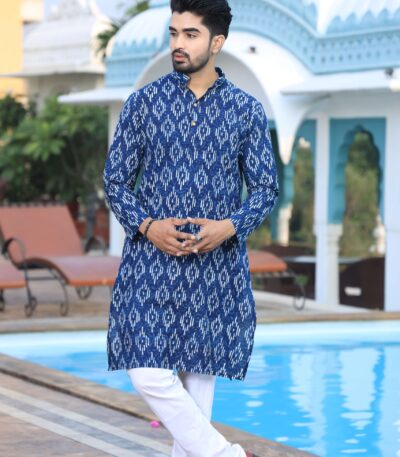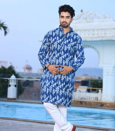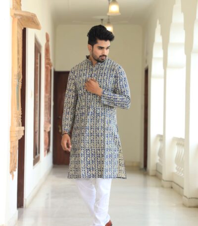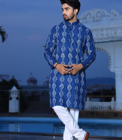 Mens Blue Handblock Printed Cotton Kurta with White Pajama ? Stylish Ethnic & Festive Wear