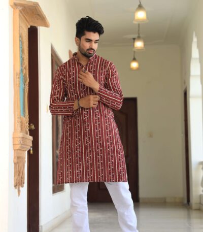 Mens Maroon Striped Printed Cotton Kurta with White Pajama ? Traditional Ethnic Wear for Festive & Wedding