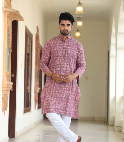 Mens Maroon Printed Cotton Kurta with White Pajama ? Traditional Ethnic Wear for Festive & Wedding