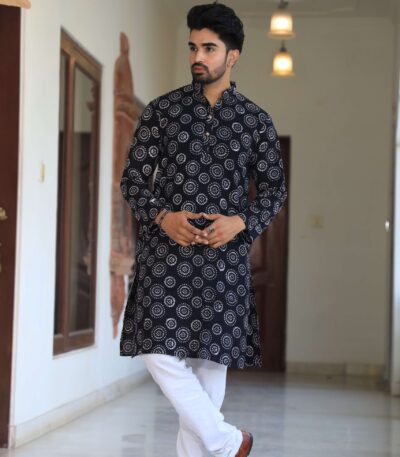 Mens Black Printed Cotton Kurta with White Pajama ? Trendy Festive & Casual Wear