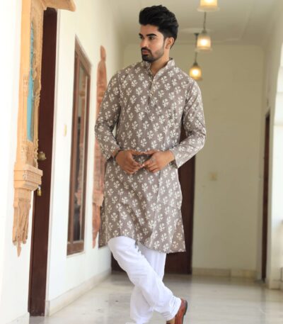 Mens Grey Printed Cotton Kurta with White Pajama ? Traditional Ethnic Wear for Festive & Wedding