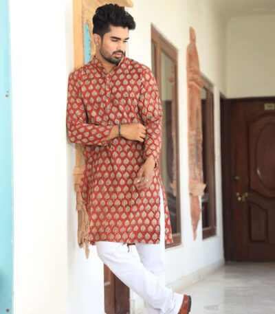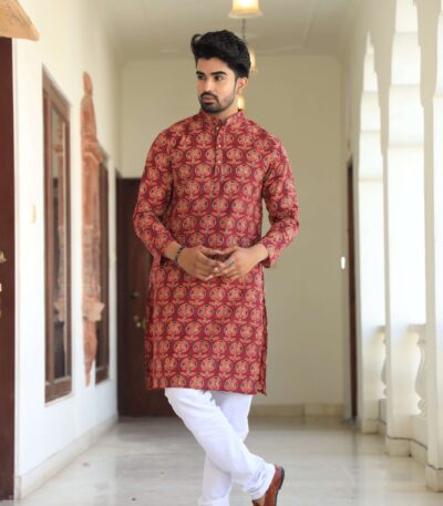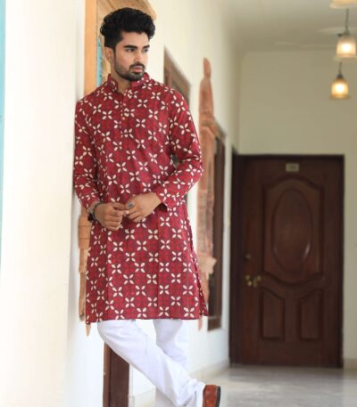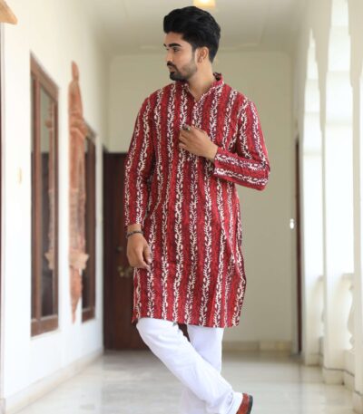 Mens Red Printed Cotton Kurta with White Pajama ? Ethnic Wear for Weddings & Festivals