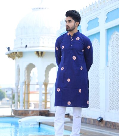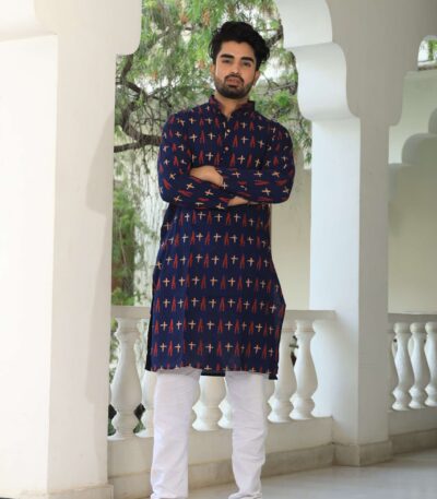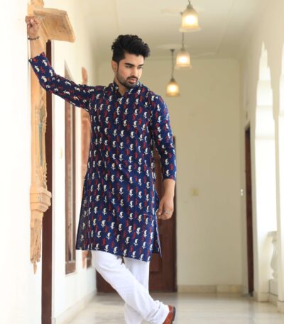 Mens Navy Blue Printed Cotton Kurta with White Pajama ? Stylish Ethnic Wear for Weddings & Festive Celebrations