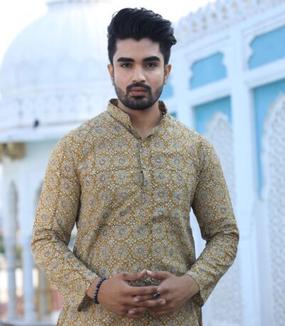 Mens Mustard Yellow Handblock Printed Cotton Kurta with White Pajama ? Traditional Festive Wear