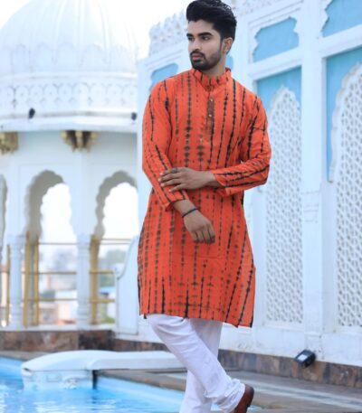Mens Orange Tie-Dye Cotton Kurta with White Pajama ? Festive & Haldi Ceremony Wear