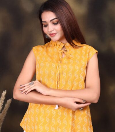 Mustard Yellow Ikat Printed Sleeveless Cotton Top for Women ? Trendy Summer Wear