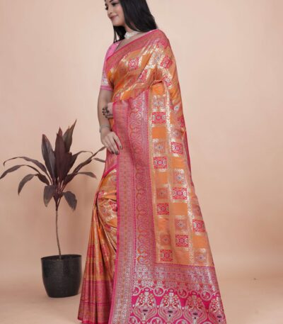 Orange & Pink Banarasi Silk Saree with Silver Zari | Wedding & Festive Saree | Traditional Banarasi Saree with Rich Contrast Pallu