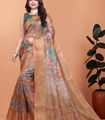 Orange & Copper Soft Silk Blend Saree with Zari Border and Printed Pallu