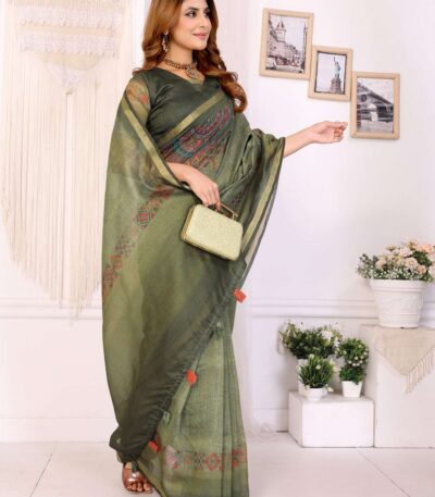 Olive Green & Blue Ikat Printed Chanderi Saree ? Elegant Festive & Cultural Wear