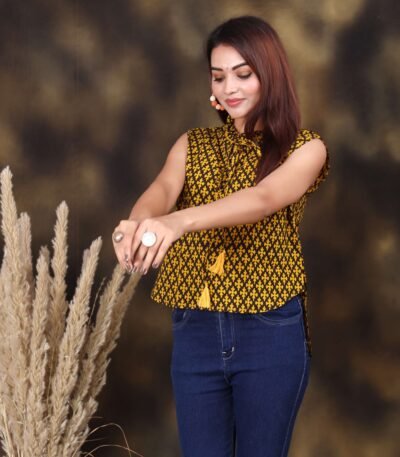 Stylish Black & Yellow Printed Sleeveless Cotton Top for Women ? Casual Summer Wear