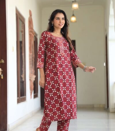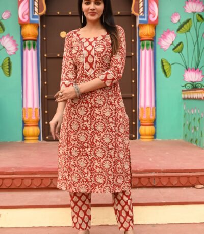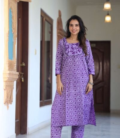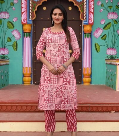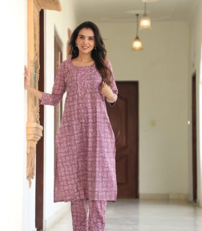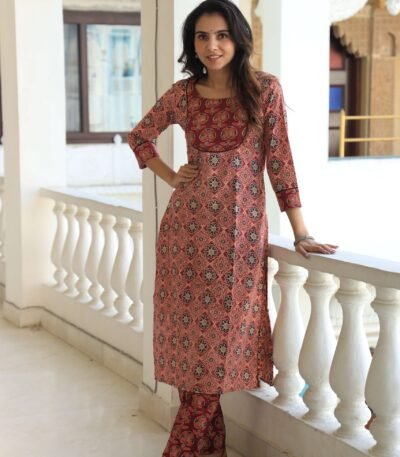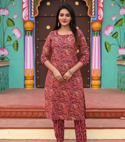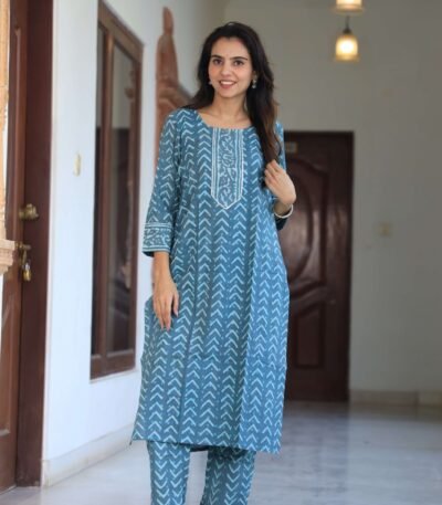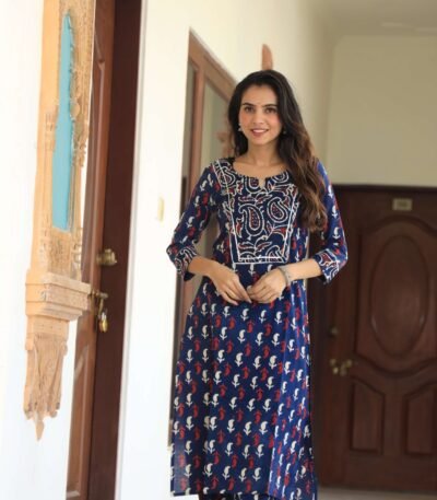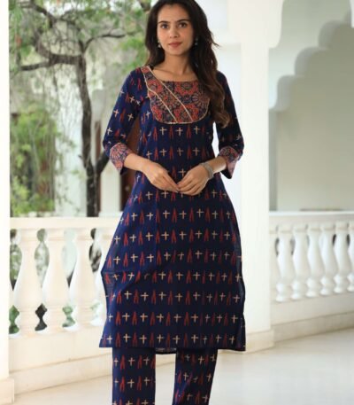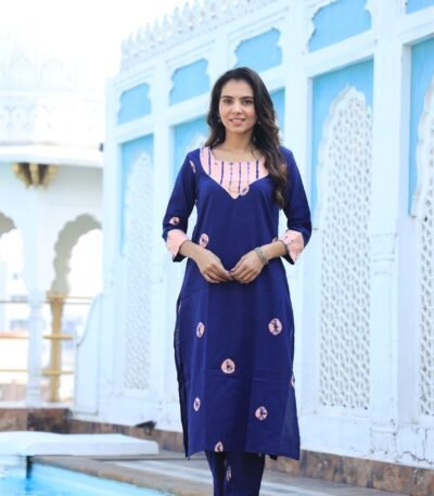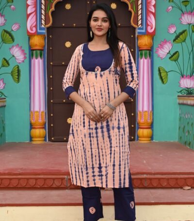 Women?s Navy Blue Cotton Kurta Set with Peach Print ? Elegant Ethnic Wear