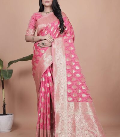 Rani Pink Banarasi Silk Saree with Golden Zari | Teardrop & Floral Butta Motifs | Wedding, Festive & Traditional Wear