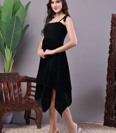 Women’s Bottle Green Junglee Pattern Velvet Handkerchief Hem Dress Midi Dresses