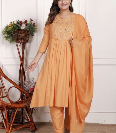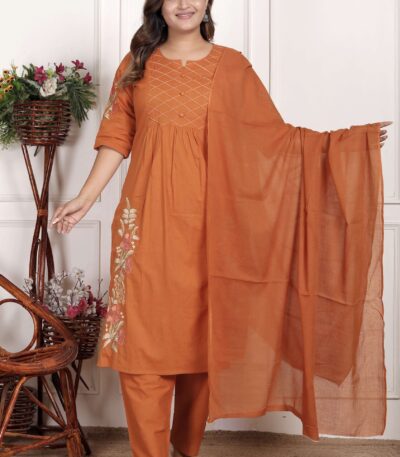 Women’s Cotton Embroidered Anarkali Kurti With Pant and Dupatta Set (ORANGE)