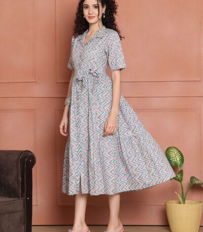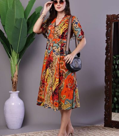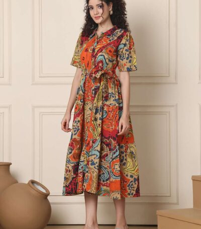 Women’s Cotton Printed A-Line Midi Dress | Short Sleeve Flared Gown Dress (Multti Color1)