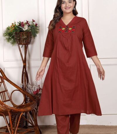 Women’s Cotton Embroidered Anarkali Kurti With Pant (Maroon)