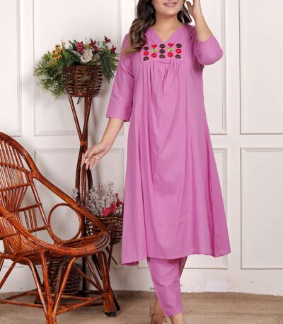 Women’s Cotton Embroidered Anarkali Kurti With Pant (PINK)