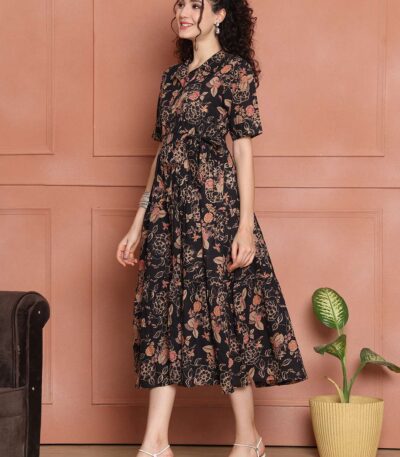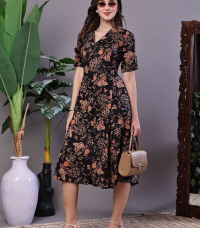 Women’s Chic Black & Rust Floral Print Button-Front Midi Dress
