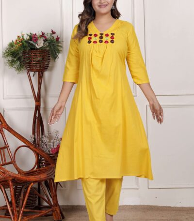 Women’s Cotton Embroidered Anarkali Kurti With Pant (Yellow)