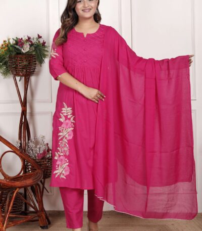 Women’s Cotton Embroidered Straight Kurti With Pant and Dupatta Set (Pink)