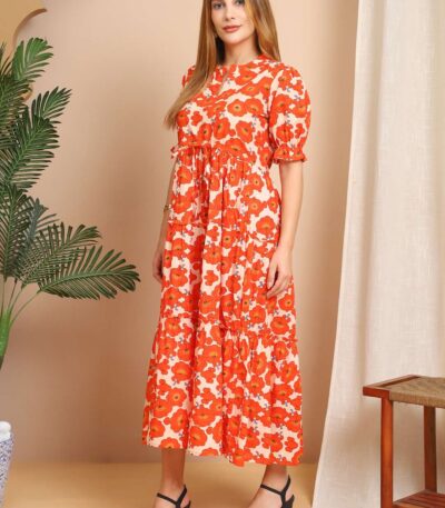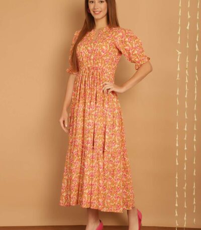 Women’s Cotton Printed A-Line Midi Dress | Short Sleeve Flared Gown Dress (Pink)