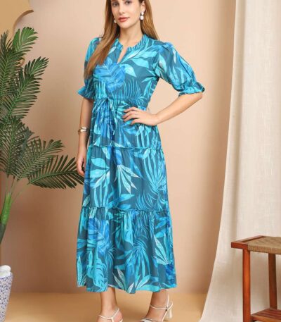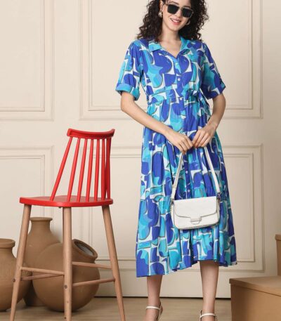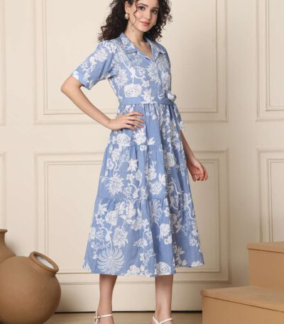 Women’s Cotton Printed A-Line Midi Dress | Short Sleeve Flared Gown Dress (Sky Blue)