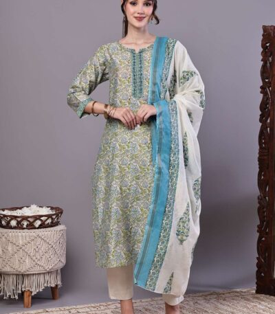 Women’s Green & Blue Floral Chanderi Printed Kurta Set with Dupatta Suit Sets
