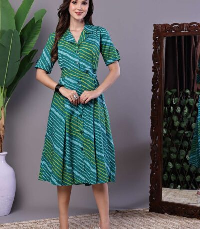 Women’s Green Cotton Printed Kaftan Dress with Drawstring Waist