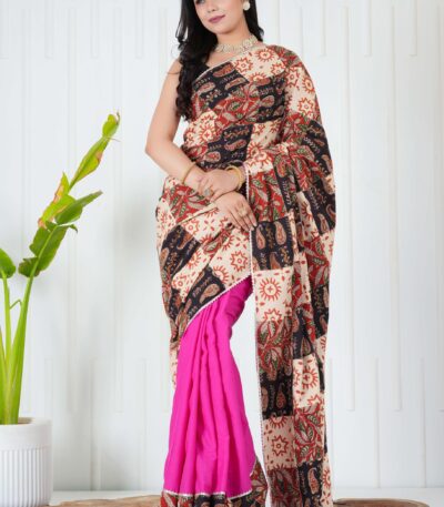 Women’s Cream Black Patchwork Printed Saree with Pink Base Blouse Piece Elegant Ethnic Wear