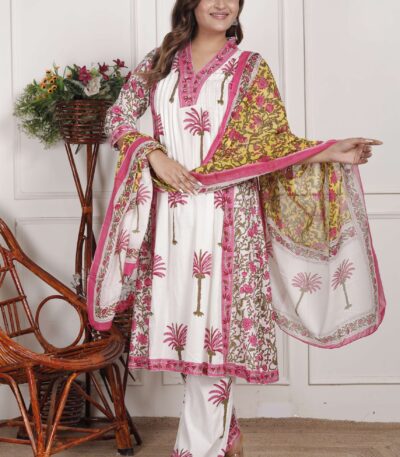 Women’s Cotton Printed Straight Kurti With Pant and Dupatta Set (White Pink)
