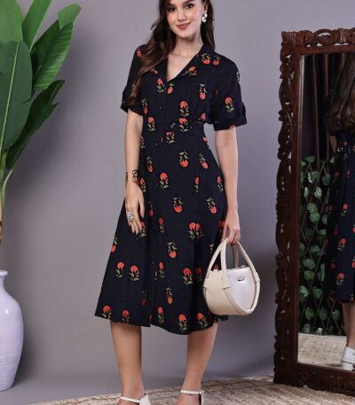 Women’s Elegant Indigo & Orange Floral Block Print Cotton Shirt Dress