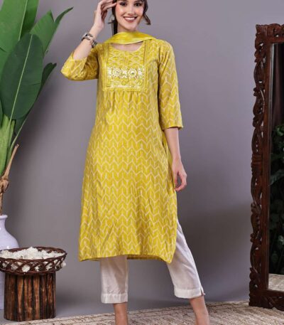 Women’s Mustard Yellow Chevron Print Chanderi Kurta Set with Mirror Work Suit Sets