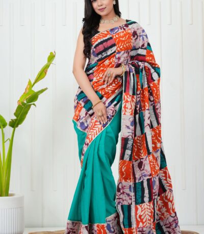 Women’s Multicolor Patchwork Printed Saree with Green Base Blouse Piece Elegant Ethnic Wear