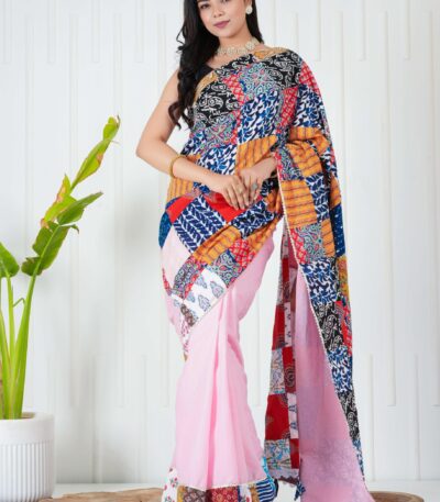 Women’s Multicolor Patchwork Printed Saree with Pastel Pink Base Blouse Piece Elegant Ethnic Wear
