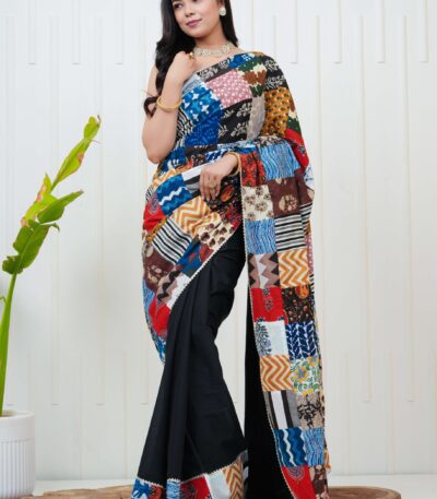 Women’s Multicolor Patchwork Printed Saree with Black Base Blouse Piece Trendy Ethnic Wear