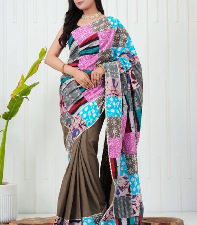 Women’s Multicolor Patchwork Printed Saree with Brown Base Blouse Piece Stylish Ethnic Wear