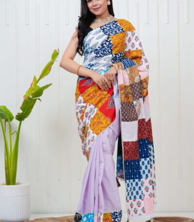 Women’s Multicolor Patchwork Printed Saree with Light Purple Base Blouse Piece Stylish Ethnic Wear