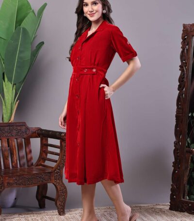 Women’s Red Velvet Solid Printed Shirt Midi Dress with Belt