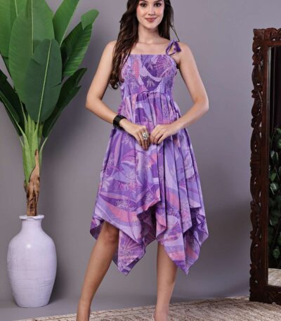 Women’s Purple Printed Cotton Handkerchief Hem Midi Dress