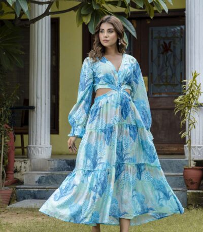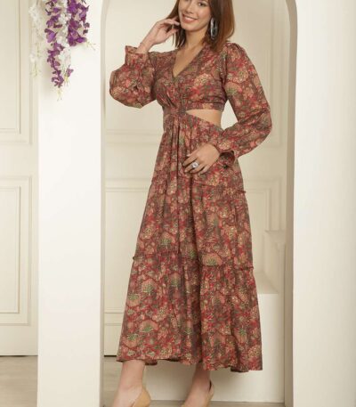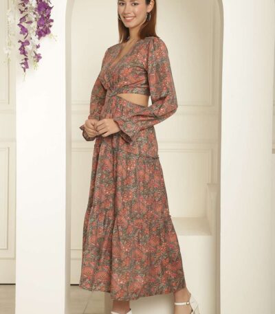 Women’s Silk Printed V-Neck Long Bell Sleeves Tiered Maxi Dress Gown