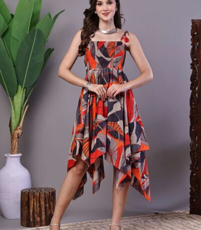 Women’s Rust & Grey Abstract Print Cotton Handkerchief Hem Dress Midi Dresses