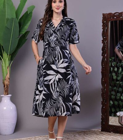 Women’s Viscos Rayon Printed Off Shoulder Midi Dress For Summer And Casual Wear (Black White)