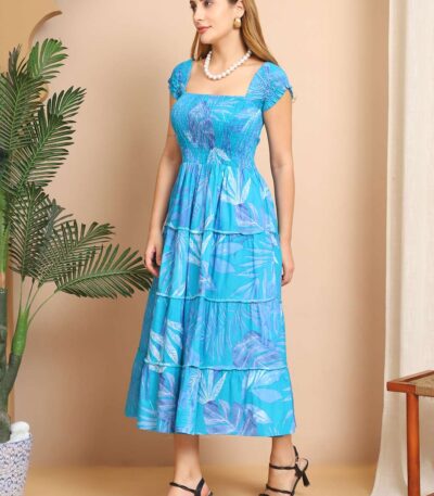 Women’s Viscos Rayon Printed Off Shoulder Midi Dress For Summer And Casual Wear (Blue Leaf)