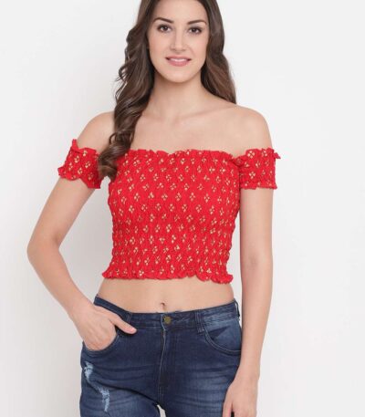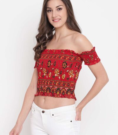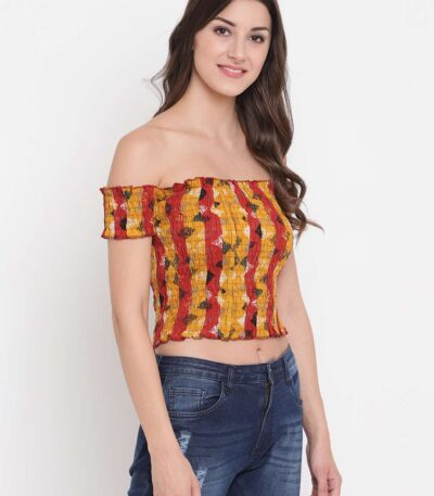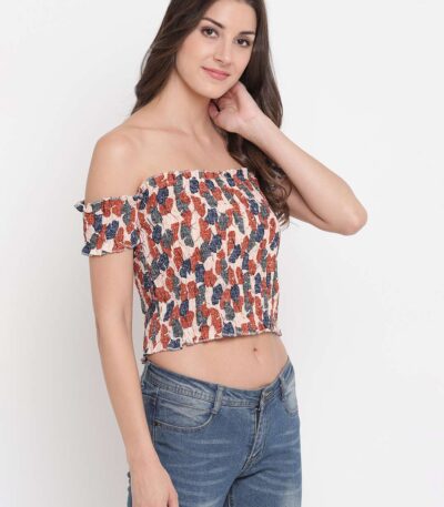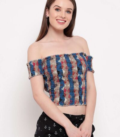 Women’s Rayon Printed Off-Shoulder Smocked Crop Top Short Sleeve Casual Styles Tank Top (FREE SIZE) Multi45