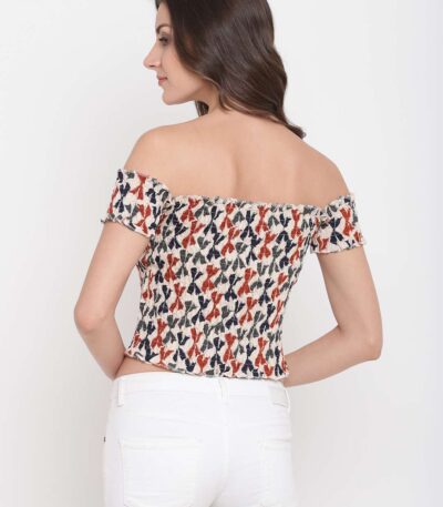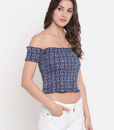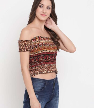 Women’s Rayon Printed Off-Shoulder Smocked Crop Top Short Sleeve Casual Styles Tank Top (FREE SIZE) Multi5
