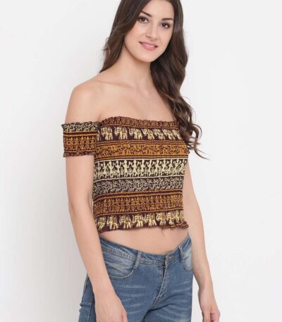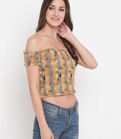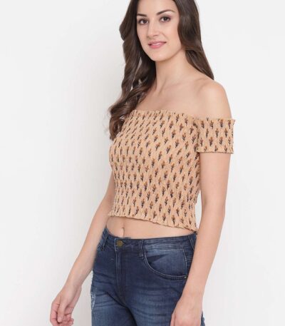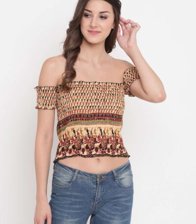 Women’s Rayon Printed Off-Shoulder Smocked Crop Top Short Sleeve Casual Styles Tank Top (FREE SIZE) Multi9