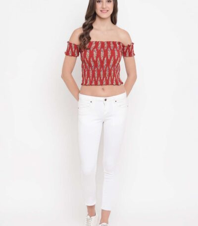 Women’s Rayon Printed Off-Shoulder Smocked Crop Top Short Sleeve Casual Styles Tank Top (FREE SIZE) Multi38